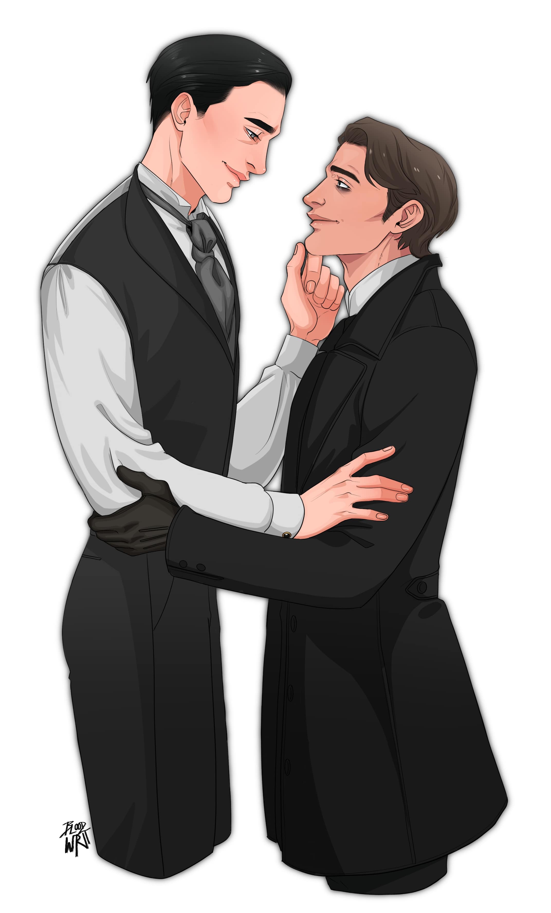 At the solid rap of a knuckle on the door to his rooms, Felipe pulled himself together and put on his usual devil-may-care expression. The look fell off his face when he came eye-to-eye with Oliver Barlow. When he told Miss Jones he was looking for Barlow, he had never expected him to actually come. Barlow rarely came up to the society’s main rooms, except to eat, and almost never paid visits. Hell, he barely opened the door of his lab. In previous trips, Felipe had knocked but received no answer despite hearing the other man moving around inside. It wasn’t the worst outcome as Oliver Barlow had the worst effect on him, yet the other man didn’t seem to notice. Barlow wasn’t beautiful in the way most men were, but he was arresting. His skin was deathly pale, to the point that Felipe had thought him ill when they first met, which was only compounded by his severe black hair and grey eyes. He reminded Felipe of a drawing done in charcoal, all hues of black and white, which carried to his clothing, as he always wore the same nearly black suit and grey tie. The most color came from Barlow’s shapely mouth, which hung agape for a brief second before it snapped shut and the solemn, stiff man he presented to the world reappeared.