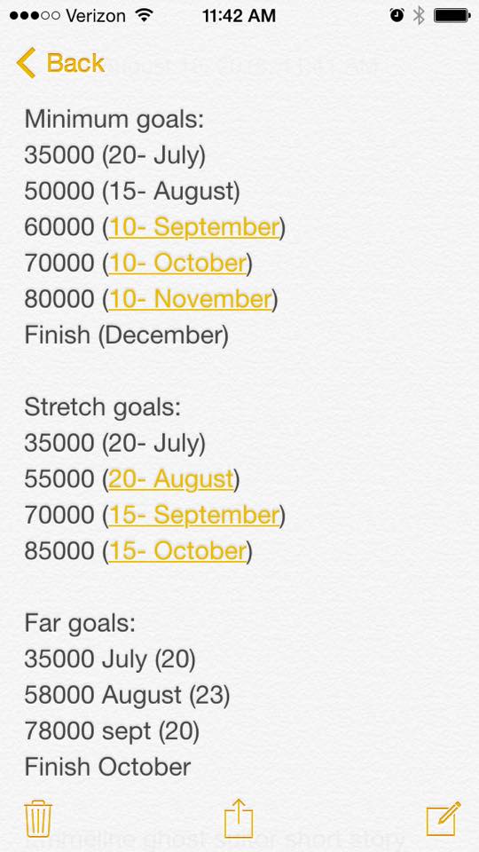 The second part of my numbers game is that I have been setting multiple goals per month. Here is a note I made for myself on my iPhone to track my writing goals for the next few months until I finish The Earl and the Artificer: