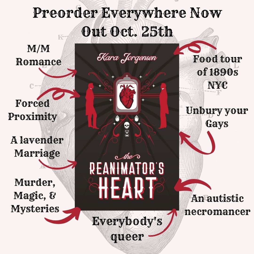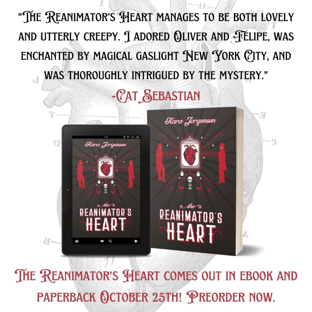 The Reanimator’s Heart is my eighth novel, and it is a sort of tie-in to Kinship and Kindness as both series center around characters working in the New York Paranormal Society. The content warnings for The Reanimator’s Heart are on my specific book page for on my website as well as on the Goodreads listing (and inside the ebook/paperback).