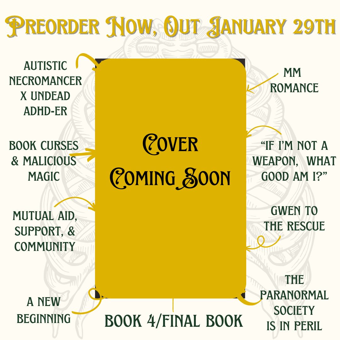 autistic necromancer x undead ADHDer, mm romance, book curses and malicious magic, mutual aid, support, community, a new beginning, if im not a weapon, what good am i?, gwen to the rescue, the paranormal society is in peril, book 4 final book